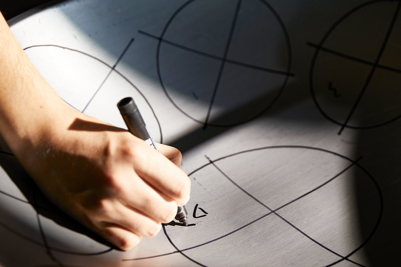 Jetzt wird festgelegt, wo auf der Oberschale später welche Töne sitzen. In der Mitte entsteht meist das Ding (der Grundton), darum herum werden die Tonfelder positioniert. Dabei geht es nicht nur um „Platz“, sondern um Balance: Tonfelder beeinflussen sich gegenseitig. Eine Handpan ist ein System – kein Satz einzelner Töne.